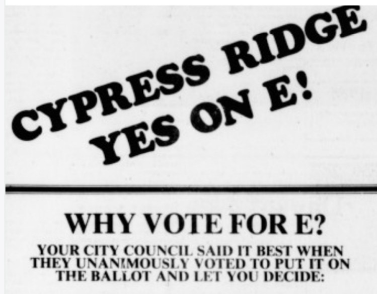 - WILL reconfirm the express will of residents who voted overwhelmingly in 1976 to acquire Cypress Ridge as a buffer against high density development.