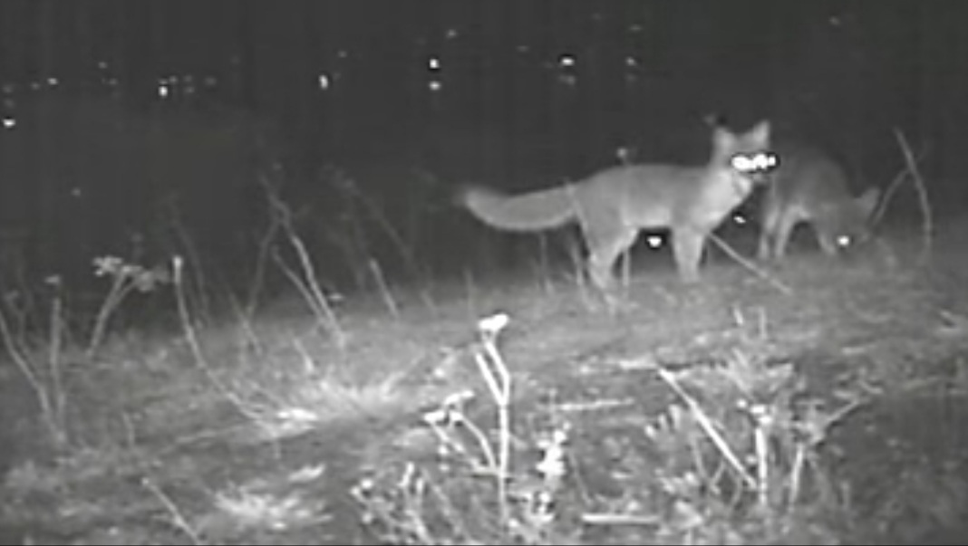 A coyote and a grey fox travel along the Wildlife Corridor (Berry).
