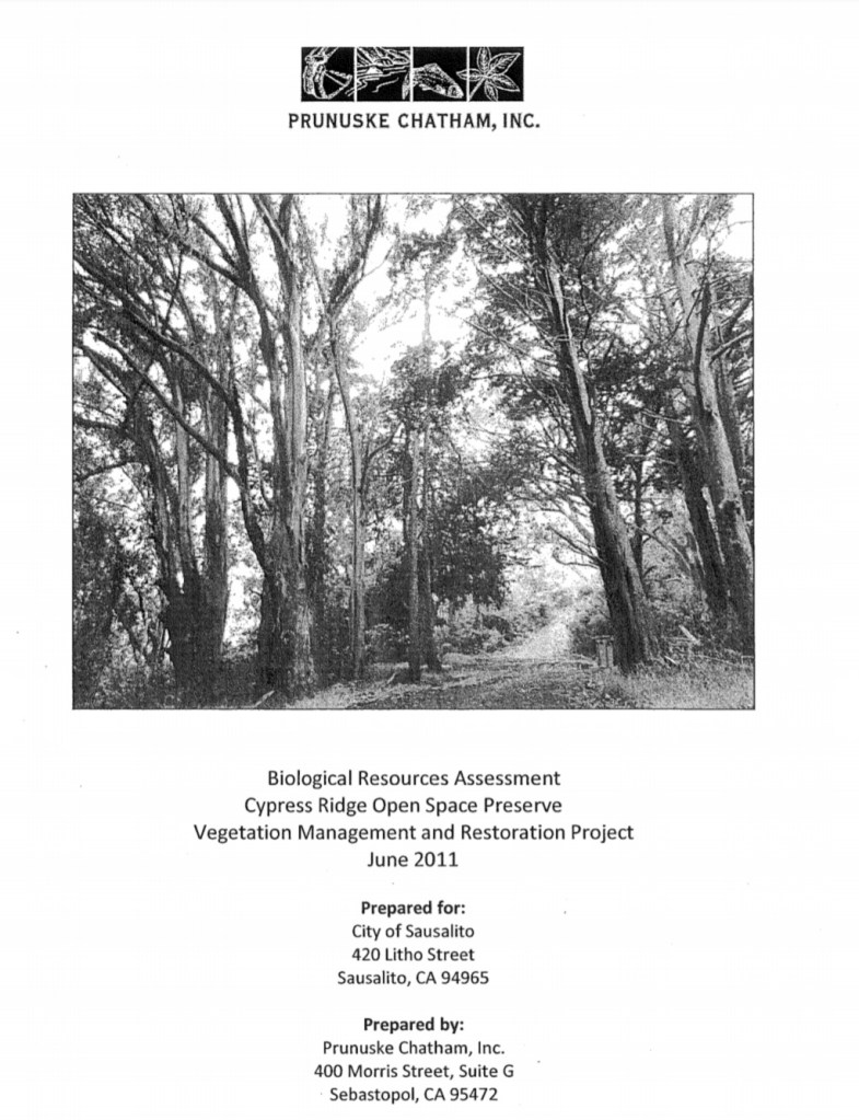 There have been two in-depth biological resource assessments done of Cypress Ridge and the immediate area in the last decade. In 2011, Prunuske Chatham, Inc. conducted a study of Cypress Ridge Open Space Preserve on behalf of the City of Sausalito to prepare for a fire hazard reduction project. And in 2017, Jennifer Berry studied the nearby Saucelito Creek Wildlife Refuge on behalf of Open Space Sausalito.
